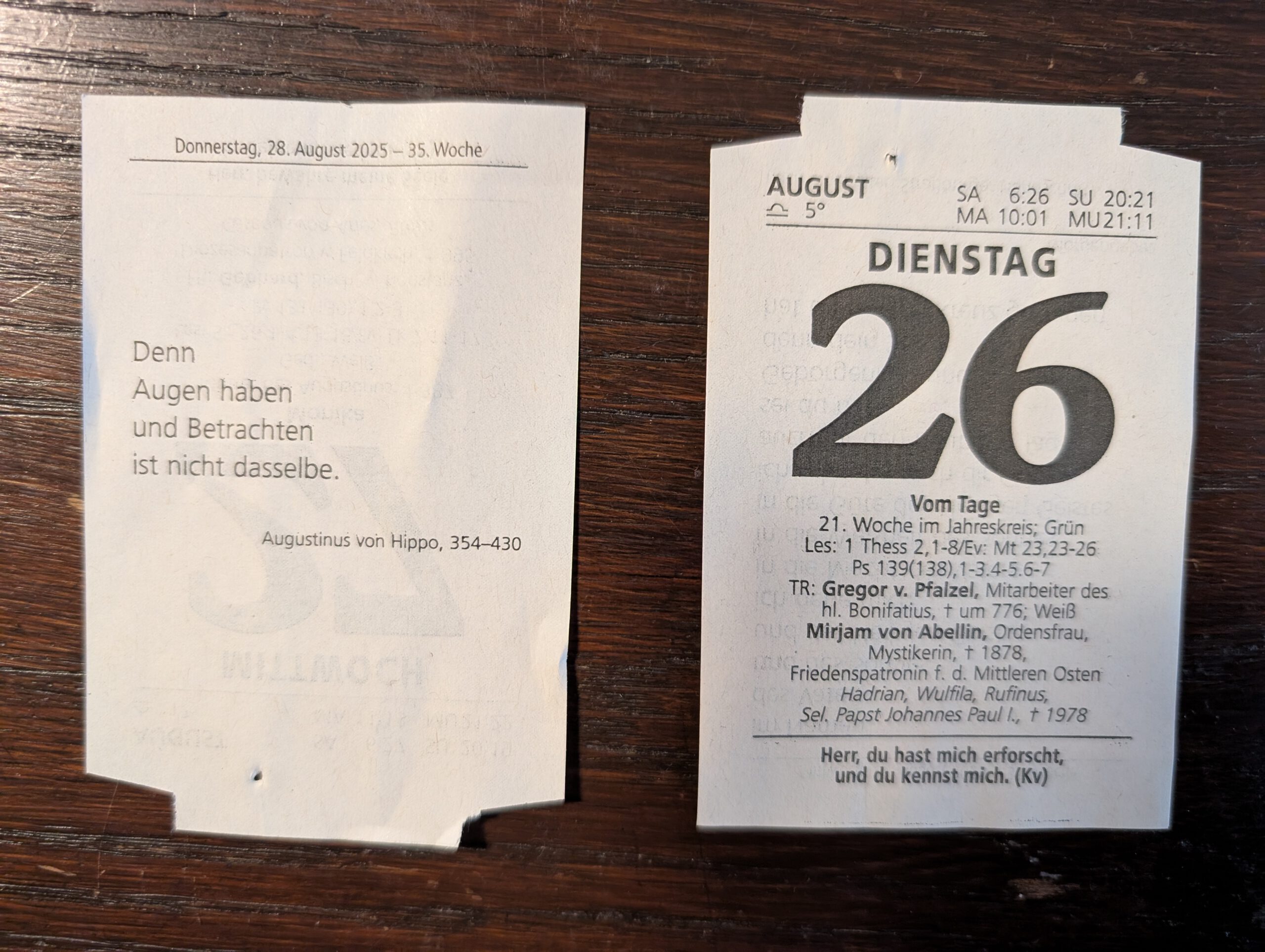 Der B.Kühlen Verlag bietet seit Jahrzehnten den Liturgischen Abreißkalender an. Neben dem Datum und Hinweisen zu Auf- und Untergang von Sonne und Mond sind auf der Vorderseite des Kalenderblattes zusätzliche Hinweise auf Lesungen und Evangelien, Psalmen, Stundengebete, Namenstage und Gedenktage vorhanden. Auf der Rückseite des Blattes sind an den Sonn- und Feiertagen die Tagesevangelien abgedruckt. An anderen Tagen gibt es für jeden Tag abwechselnd noch Gebetsanliegen des Papstes, Gedanken Aphorismen großer Denker, Theologen und Heiliger aus Vergangenheit und Gegenwart