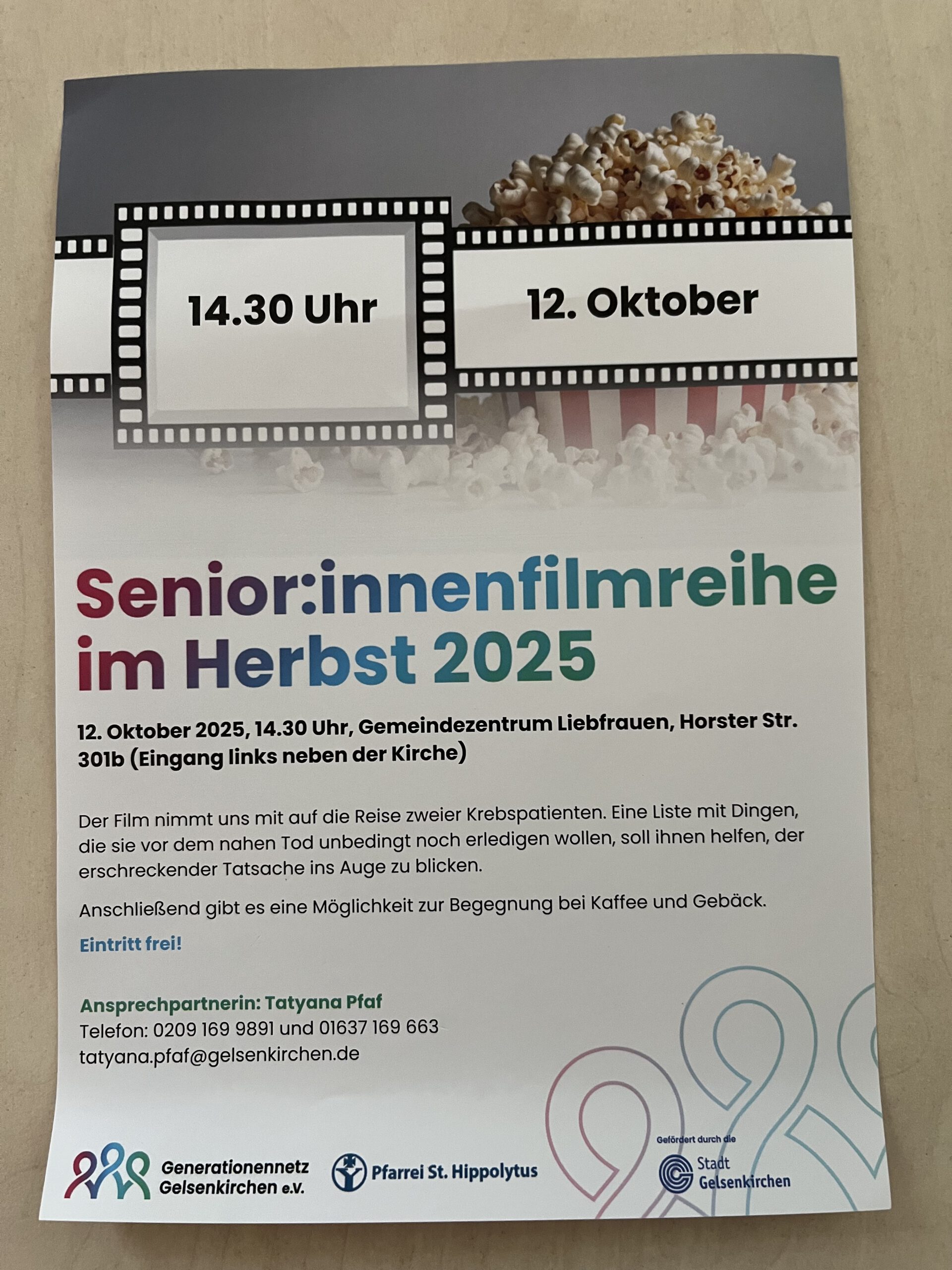 Das Generationennetz Gelsenkirchen e.V. bietet in Kooperation mit der Pfarrei St. Hippolytus und gefördert durch die Stadt Gelsenkirchen ab 12.10.25, 14:30 Uhr eine Senior*innenfilmreihe an.