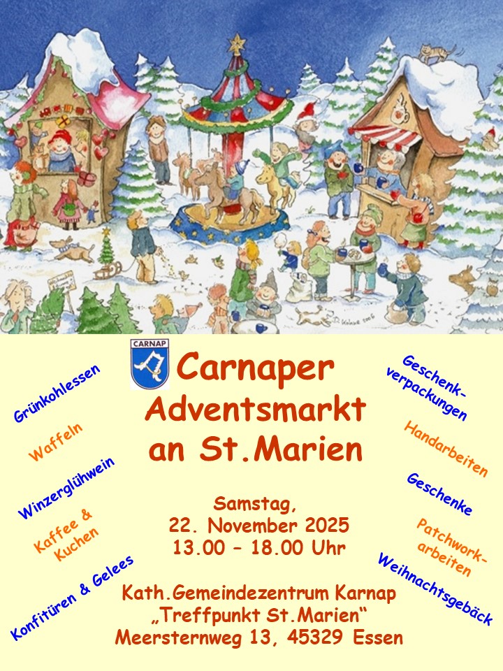 Der Förderverein an St. Marien e. V. lädt herzlich am 22.11.2025 ab 13 Uhr zum traditionellen Carnaper Adventsmarkt in den Gemeindesaal an St. Marien ein. Wir starten in gemütlicher Atmosphäre mit leckerem Grünkohl, wahlweise mit Mettwurst. Anschließend gibt es bei selbstgebackenen Torten und Kuchen, fluffigen Waffeln, frischem Kaffee, würzigem Winzerglühwein oder auch regionalem Bier Gelegenheit zum Austausch und Beisammensein.