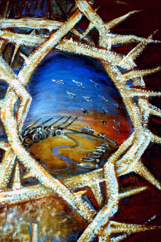 Heute stehen Völker und Nationen im Mittelpunkt, die kriegerisch ihre eigennützigen Interessen gewaltsam durchsetzen. Es sind Szenen, die nicht abstrakt sind, sondern die uns in eine Auseinandersetzung bringen möchten. In welcher Welt möchte ich leben?