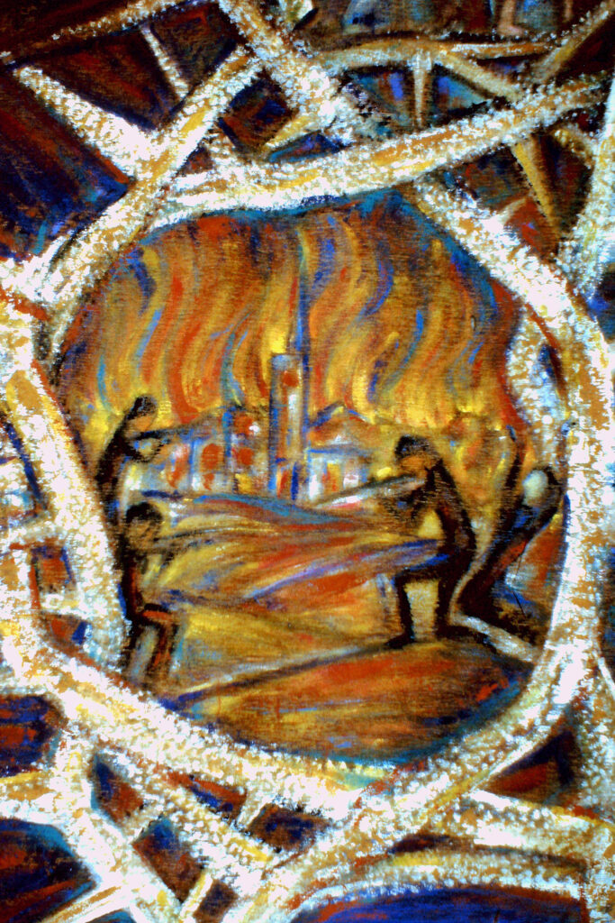 Heute betrachten wir auf dem Hungertuch die Medaillons rechts und links in der Mitte. – Krieg und seine Zerstörungen.