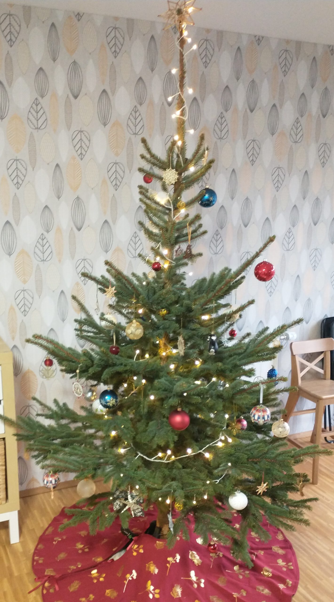 geschmückter Tannenbaum im Wohnzimmer mit bunten Kugeln und Lichterkette